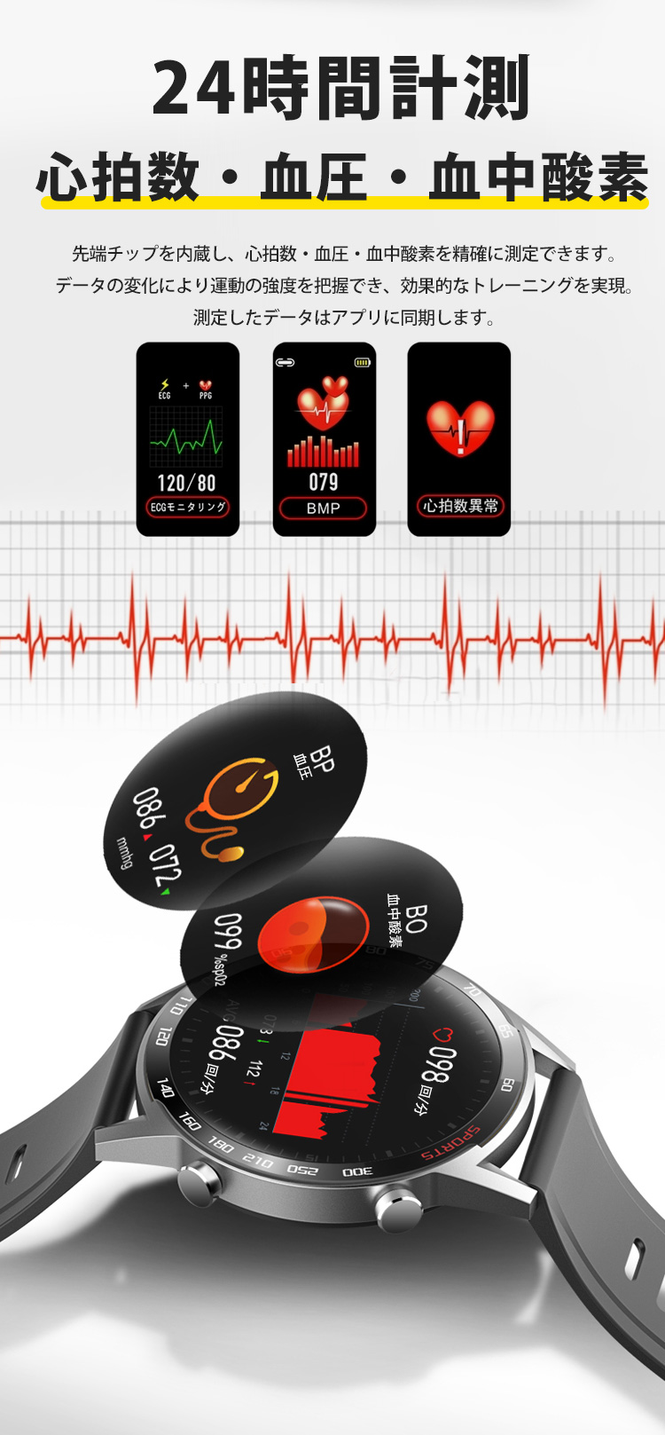 【スマートウォッチ】新型設計、体温測定、心拍数・血圧計測、24時間健康管理、IP67防水